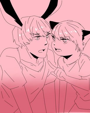 下の日記で描いた猫主とうさ主を共演させてみました。 特殊嗜好なんで大丈夫な方はつづきよりご覧くださいませ。 拍手ありがとうございますーーー!!感謝です! はやくサイトの方も更新再開せねば・・・!48でちゅー(?)させたいので 描きなおしもしたいのですが・・・うーむ。 その前に本をなんとかせにゃー コピー本作ってるんですが、紙選びにものすごい時間かかってしまいました。 あんなに真剣に紙を選んだことはございませんよ。 紙を手にとっては厚みや光沢を確かめ、あーでもないこーでもないと一人うろうろいったりきたり・・・。 完全な変質者ですよ。一 でもなんかこうゆうのって楽しいですね |